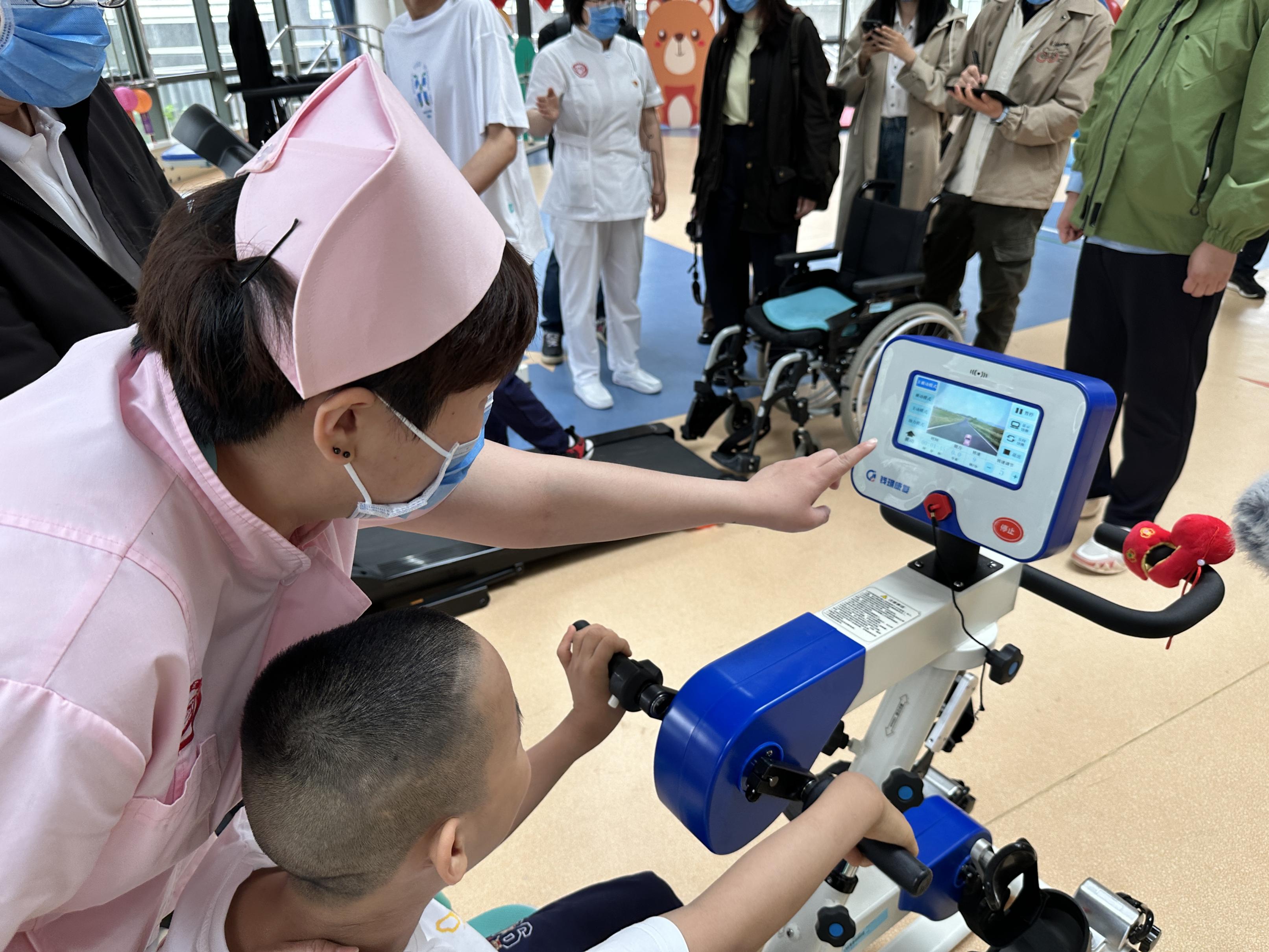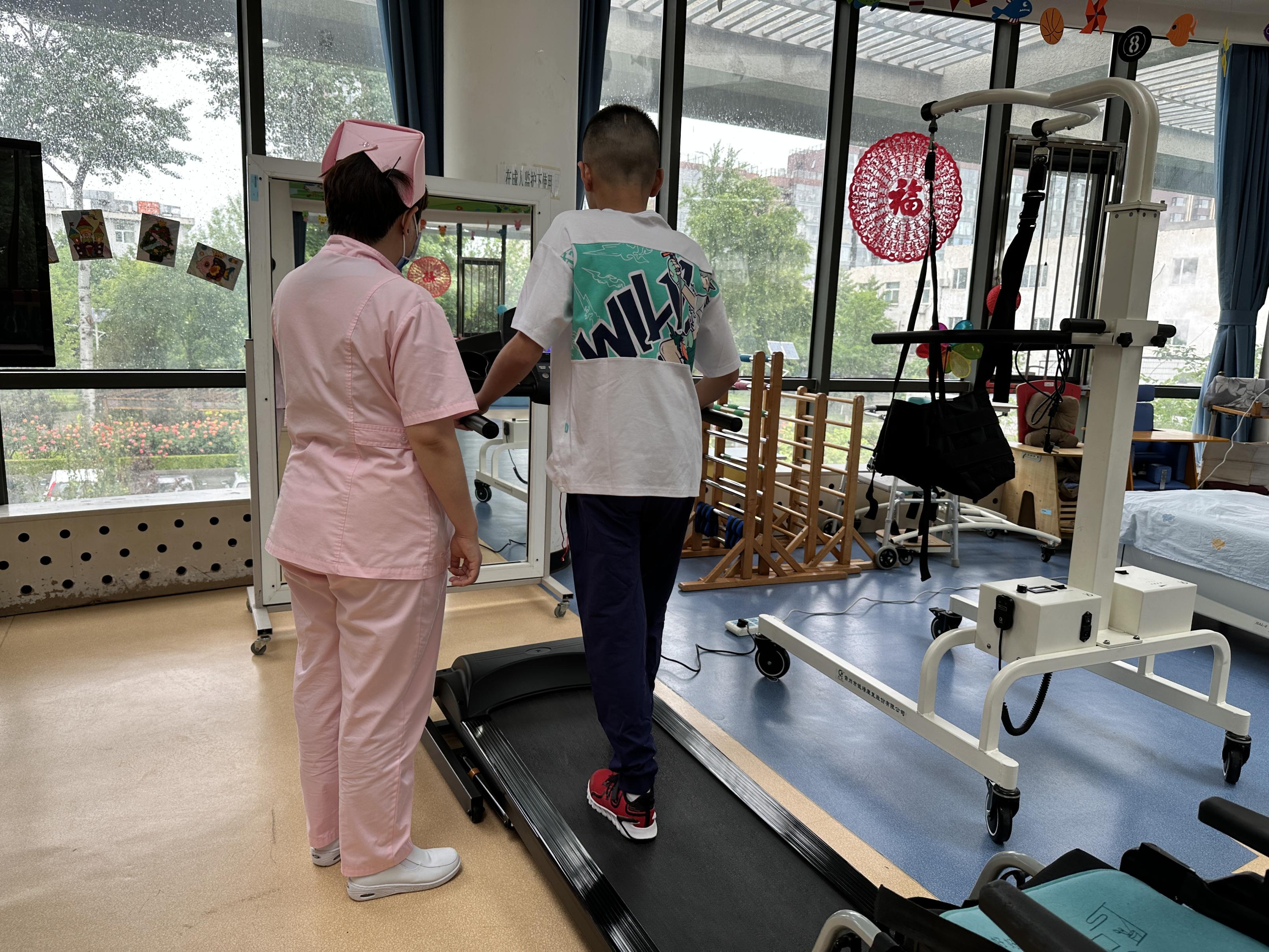 在康复示范中心,16岁的才才(假名)在责任主谈主员的追随下正在进行康复检修。责任主谈主员先容,才才患有脑瘫,刚来院里时还不会走路。在大夫、照拂、康复师等责任主谈主员的不懈尽力下,指导才才坚握检修,考验下肢力量。如今,才才仍是大略我方翻身荆棘床,孤苦去卫生间。
